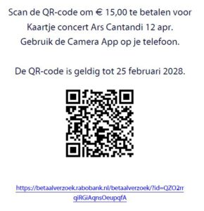 U kunt ook het bedrag overmaken via onderstaande QR-code, waarbij u bij de betaling het bedrag aanpast aan het aantal bestelde kaartjes. Wel graag de ingevoerde gegevens van dit formulier verzenden, met de knop ‘verzenden!